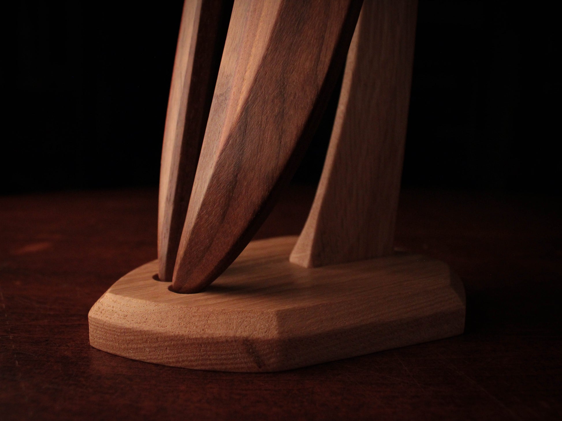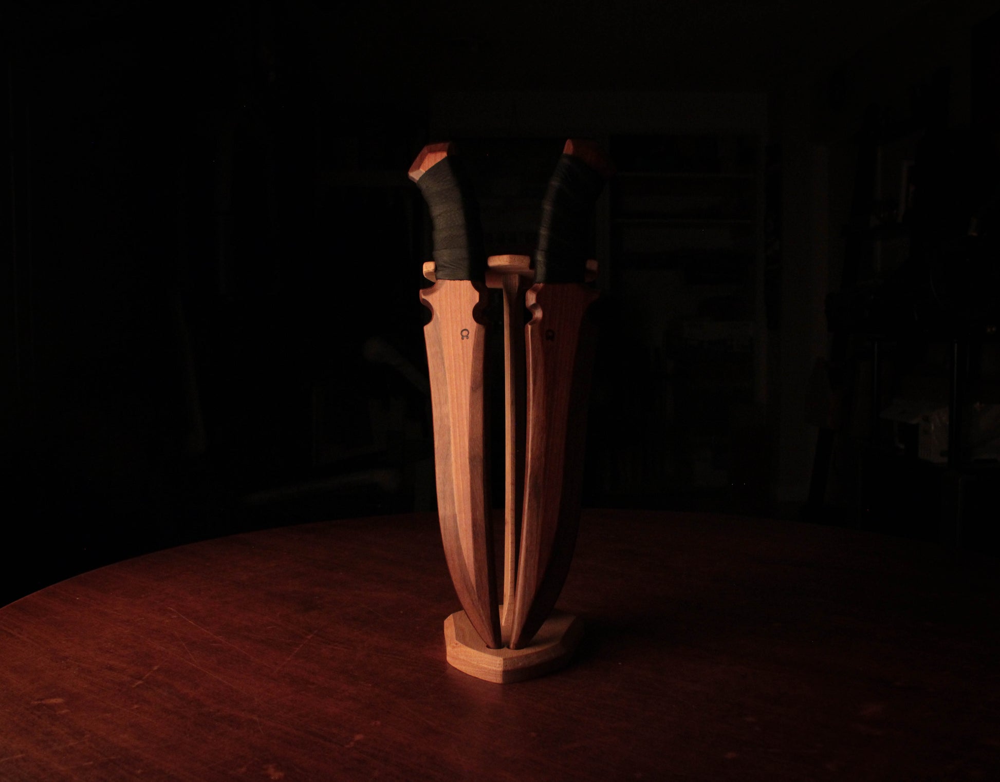 These two-toned amalgam of Black Walnut faced with veneers of Cherry (3) and Birch (1), come in a set of pairs, wrapped in luxurious black leather about the grip, and sat atop an elegant and specially made upright stand in Red Oak.